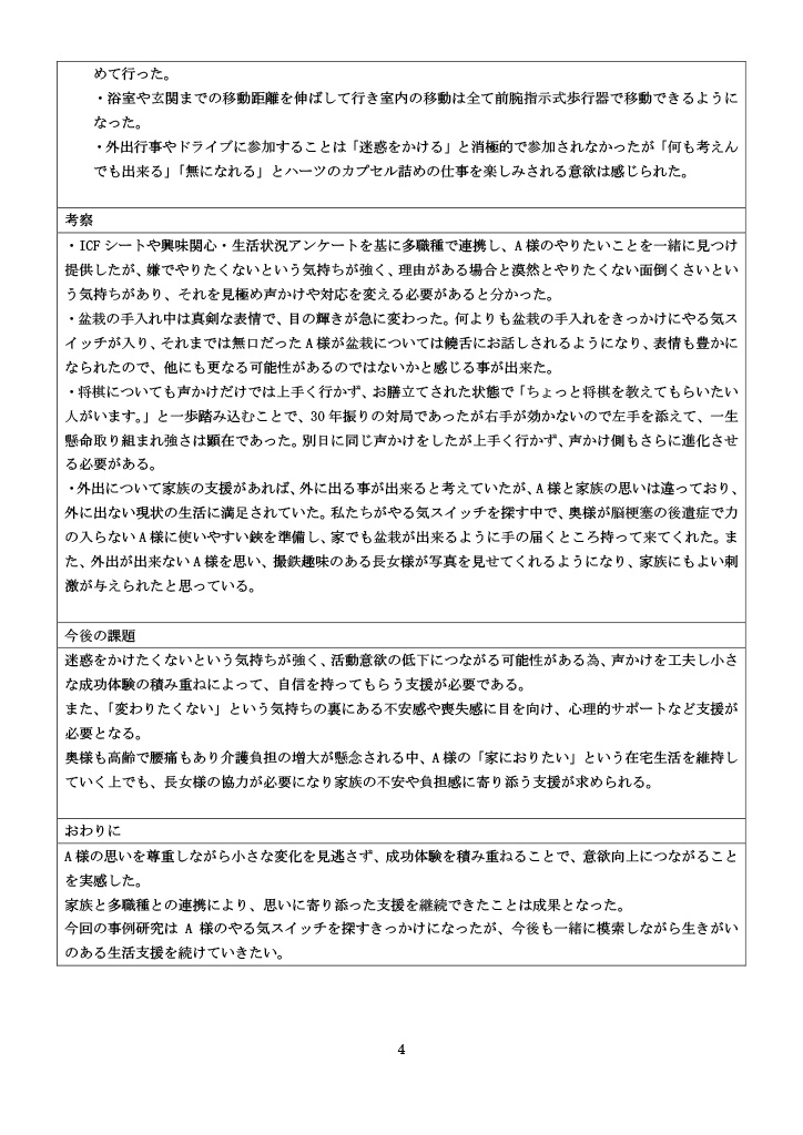 「外出は迷惑をかける」「生きているだけでいい」と話すA さんは、度重なる転倒から活動への意欲が低下していた。自分らしい生きがいを取り戻すことを目的に、『生協10の基本ケア』の視点「夢中になれることをする」「ケア会議をする」を中心に多職種で協働し環境調整をするケアを行った。以前に戻すのではなく、どうすれば本人が楽しいと感じることを新たに選択できるか。
