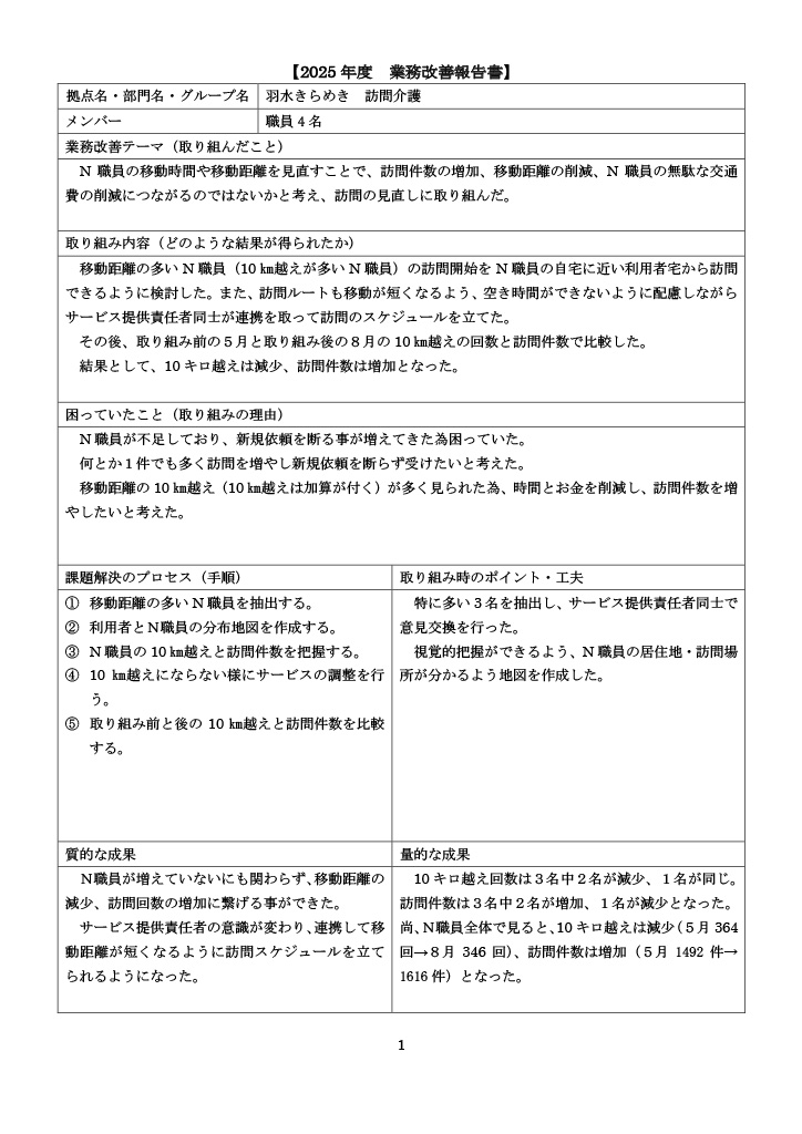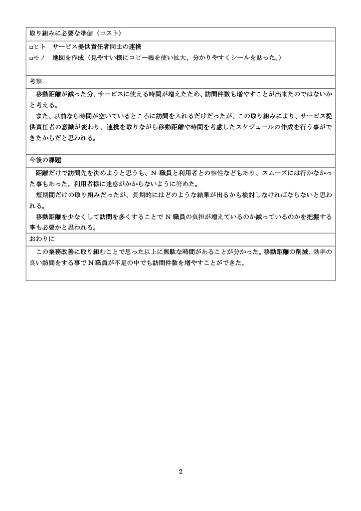 ここ数年、訪問介護に携わる職員が当生協でも不足しており、新規のご依頼を断る事が増えてきたことに悩んでいた。そこで、何とか1件でも多く訪問を増やし新規依頼を断らず受けたいと考え、移動時間や距離を見直すことで訪問件数の増加、移動距離の削減、訪問職員の移動交通費の削減につながるのではないかと考え、改善に取り組んだ。