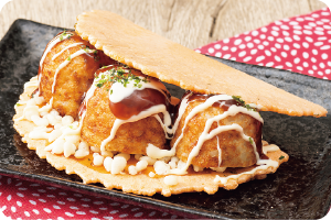 半分に折ったえびせんにたこ焼をぎゅーっと挟んで。