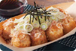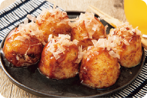 たこ焼が焼き上がったら、美味しさのポイントである水分が飛ばないように、まだアツアツのうちに一気に冷凍。ご家庭で電子レンジ調理した時に一番美味しいふわとろ状態になるように作られています。