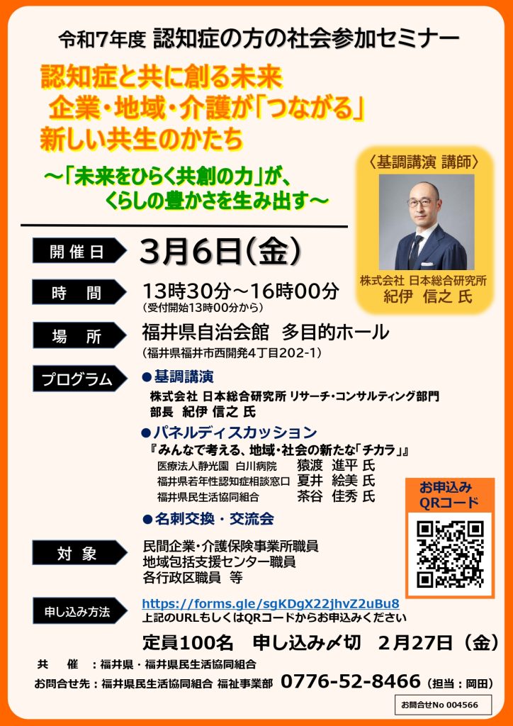 ○基調講演 株式会社日本総合研究所 リサーチ・コンサルティング部門 部長 紀伊 信之 氏 ○パネルディスカッション 医療法人静光園 白川病院 猿渡 進平 氏 福井県若年性認知症相談窓口 夏井 絵美 氏 福井県民生活協同組合 茶谷 佳秀 氏 |