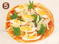 4の生地にケチャップを塗り、2、手でちぎった大葉、ピザ用チーズをのせ、230℃のオーブンで約10分焼く。