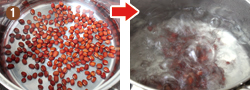 鍋に茹でこぼした小豆とたっぷりの水を入れ、中火にかける。