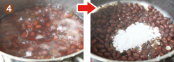 2の小豆をつまんで、つぶれるくらいの柔らかさになったら煮汁を少しだけ残して捨て、砂糖を加えひと煮立ちさせる(焦げないように)。