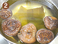 1と干ししいたけを水1.2ℓにつけて、冷暗所に一晩置く。